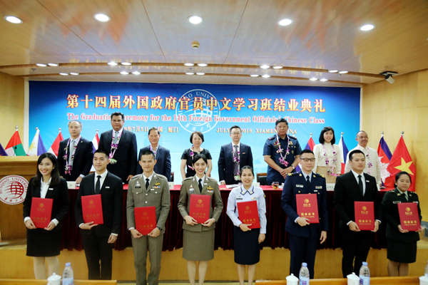 第十四届外国政府官员中文学习班结业典礼7月5日上午在华侨大学厦门校区举行。来自泰国、老挝、印尼、菲律宾、阿联酋、柬埔寨、越南等七国供职于警察总署、商务部、议会、移民局等部门的102名政府官员圆满完成在华为期一年的学习,顺利结业。