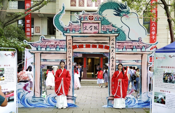 红灯笼、汉服、书法,还有“龙门”……文学院的迎新点古色古香,尽显中国传统文化的魅力。进入迎新点,即“鱼跃龙门”,寓意十年寒窗,一跃文院;一旁的及第签名板,寓意金榜题名,时候正好。