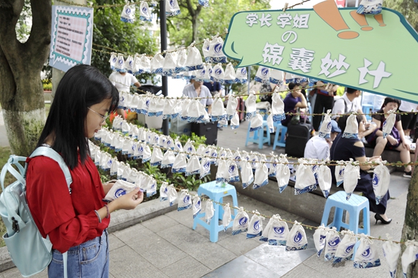 外国语学院在迎新点的一侧挂上许多小巧精致的锦囊,其中包含了学长学姐写下的关于学习生活的小贴士以及糖果,希望以这“云中谁寄锦书来”的形式,让新生感受到温暖与关怀,促进新老学生的交流。土木工程学院将华大标志建筑行政研发大楼和校大门的结构模型放置于迎新点前;厦航学院在机舱模型中为新生带来独具学院特色的“入学报到飞行体验”;法学院则赠予每一位新生专属书签,祝愿大家与法同行,学有所成。