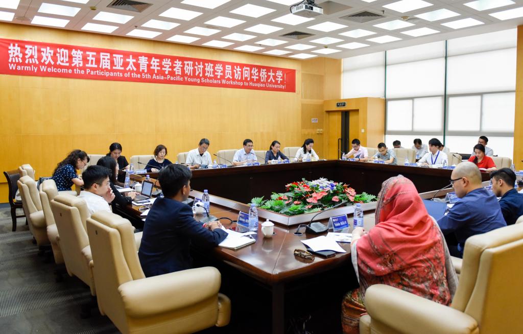 9月6日下午,参加第五届亚太青年学者研讨班的十三国学者到我校交流访问。交流会在王源兴国际会议中心202室举行。