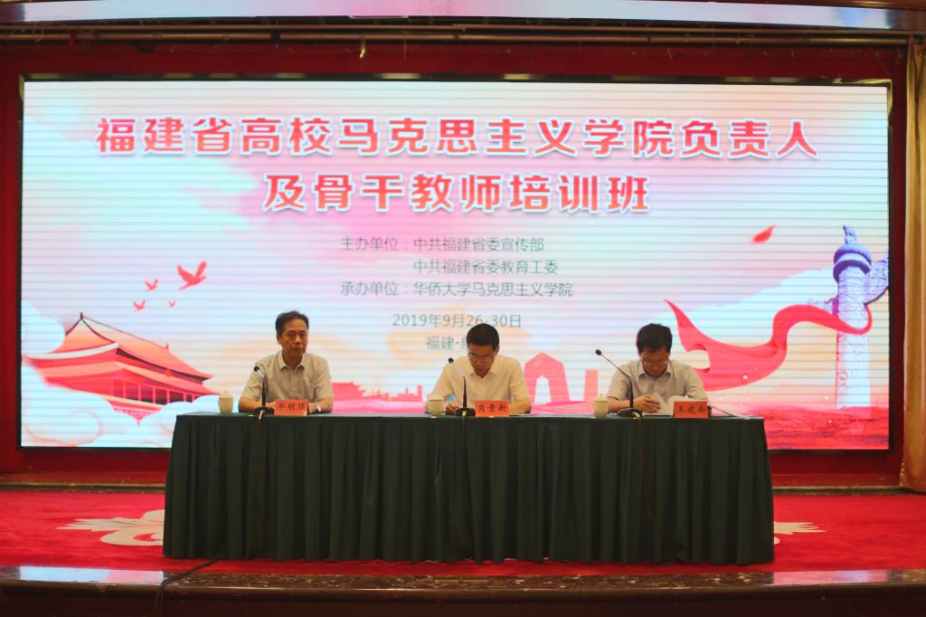 省委常委、省委宣传部部长梁建勇审定本次培训方案。省委宣传部副部长肖贵新、省委教育工委副书记王建南,华侨大学党委副书记、纪委书记毕明强,以及省委宣传部理论处、省委教育工委思政处相关负责人出席开班式。来自省内46所设立马克思主义学院高校的近百名学员参与培训。