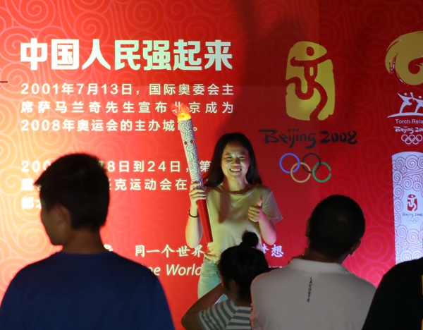 时光长廊前学生手拿奥运火炬留影