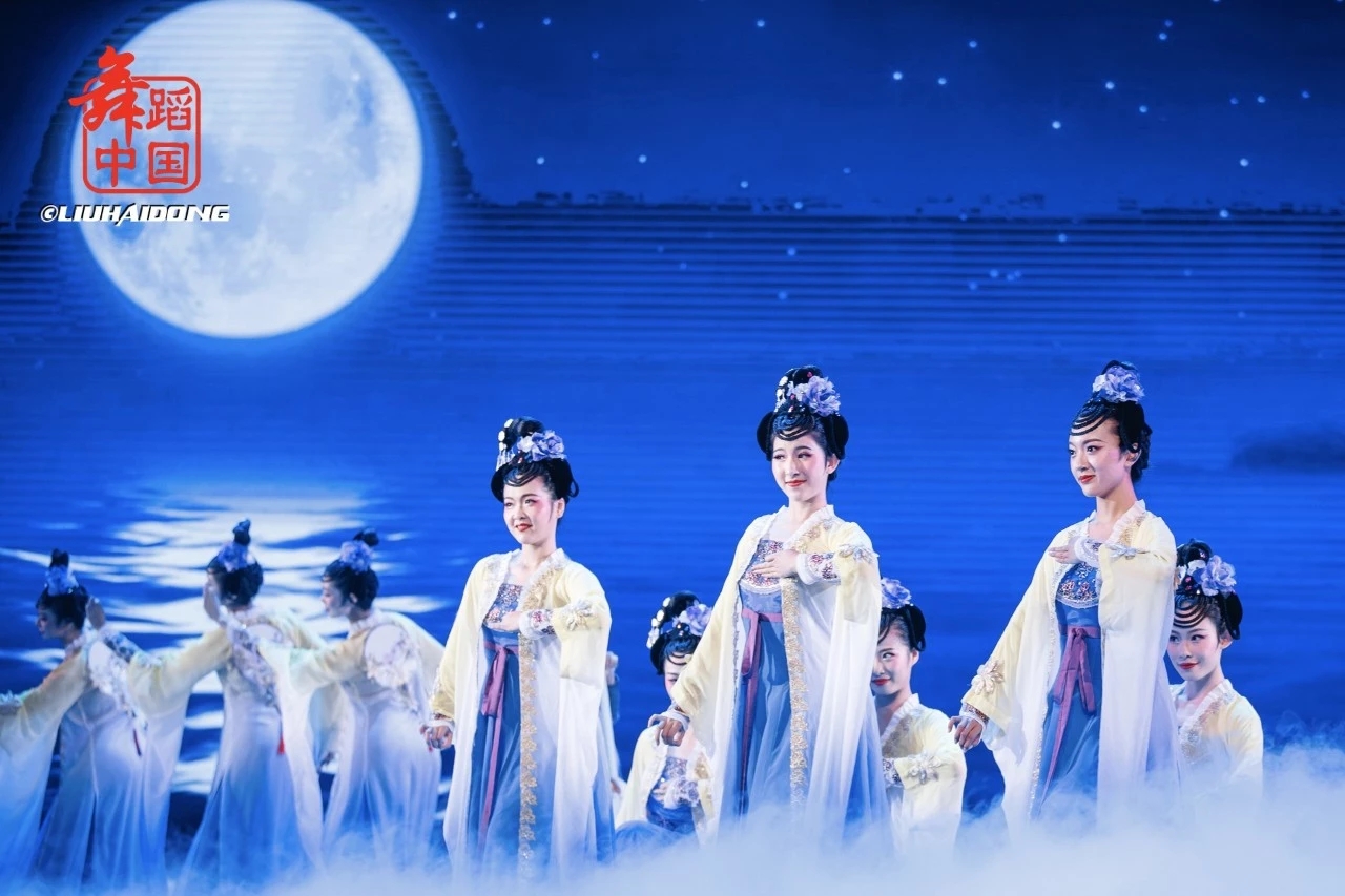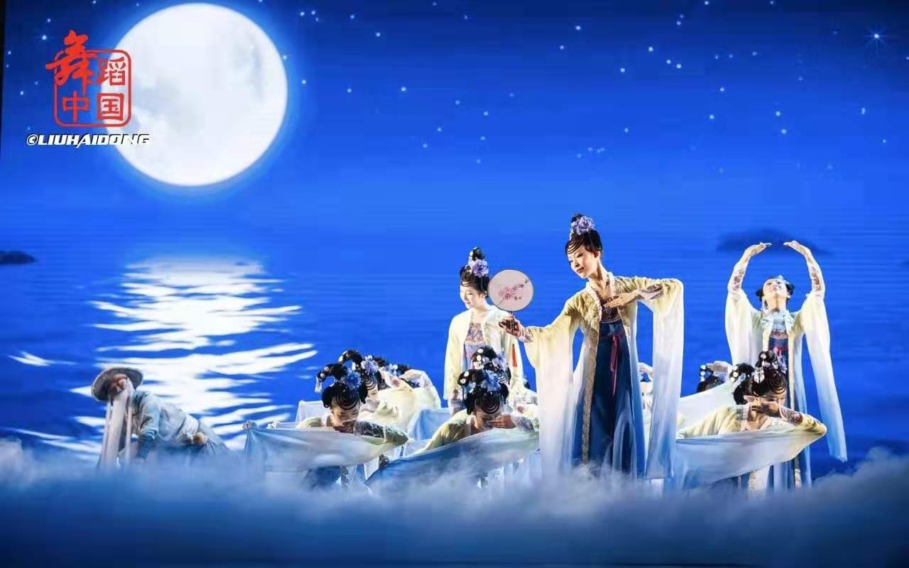 《笋江月影》的音乐、灯光、舞美、服装与舞蹈情节、氛围相得益彰,呈现出“舟行碧波上,人在画中游”的舞台感。特别是用九把团扇制造了中秋夜从九孔桥洞中看到九个月亮同时冉冉升起的画面,让观众领略到泉州十八景之一的“笋江月影”之奇妙景观。