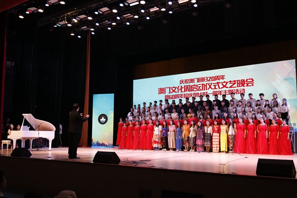 这,是在庆祝澳门回归20周年、澳门文化周启动仪式文艺晚会上的一幕。当晚,包括澳门学生在内的数百名海内外学子以及众多校友汇聚一堂,以一场青春联欢的视听盛宴,为澳门祝福,为祖国歌唱。