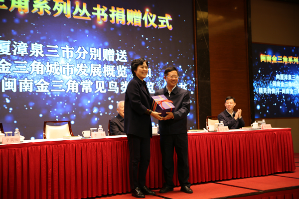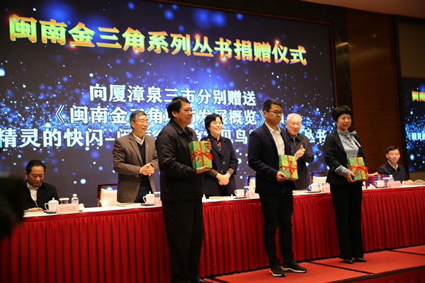 12月29日,华侨大学哲学社会科学文库·闽南金三角系列丛书《闽南金三角城市发展概览》《精灵的快闪——闽南金三角常见鸟类概览》出版发行和赠书仪式在厦门举行。福建省原副省长李红,厦门市原市委书记邹尔均,华侨大学原党委书记李冀闽,厦门市委副书记陈秋雄,漳州市委常委、宣传部部长刘伟泽,泉州市委常委、秘书长季翔峰等出席活动。华侨大学党委副书记刘斌主持发布会并致辞。