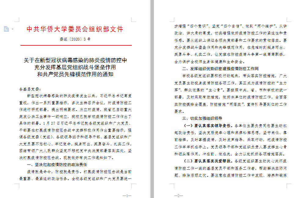 生命重于泰山,疫情就是命令,防控就是责任。疫情发生后,按照中央统战部、福建省、教育部和地方政府防控疫情的部署要求,学校党委高度重视,将疫情防控作为学校当前工作的头等大事,启动应急预案,迅速部署成立了华侨大学新型冠状病毒感染肺炎疫情防控工作领导小组,校党委书记关一凡、校长徐西鹏担任组长。学校印发通知要求全校各级党组织和广大党员,发挥先锋模范作用,在危难时刻挺身而出、英勇斗争、扎实工作,全力保护全校师生身体健康和生命安全。