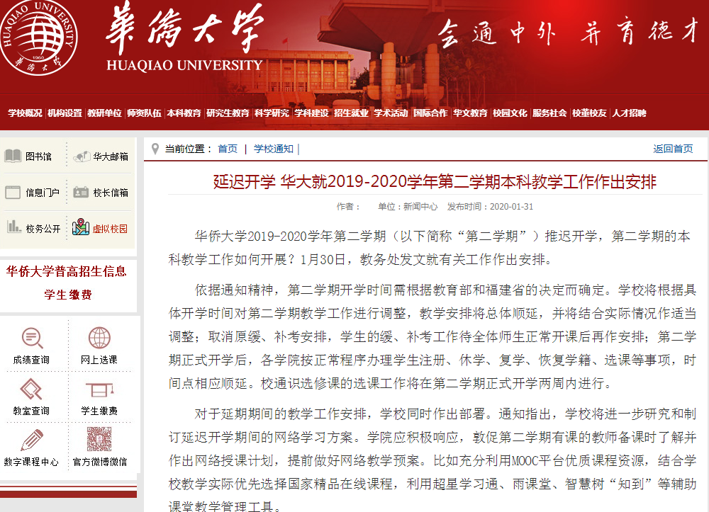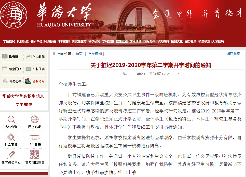 华侨大学率先在全省发出推迟开学的通知,阻断疫情传播。要求在学校通知正式开学之前,全体学生不要提前返校,对于确实需要提前返校的学生,将统一在医学观察隔离区隔离14天后再进行正常学习生活。针对湖北籍师生,一律要求暂不返校,并做好健康管理,及时反馈信息;其他地区教职工返校实行审批制度。