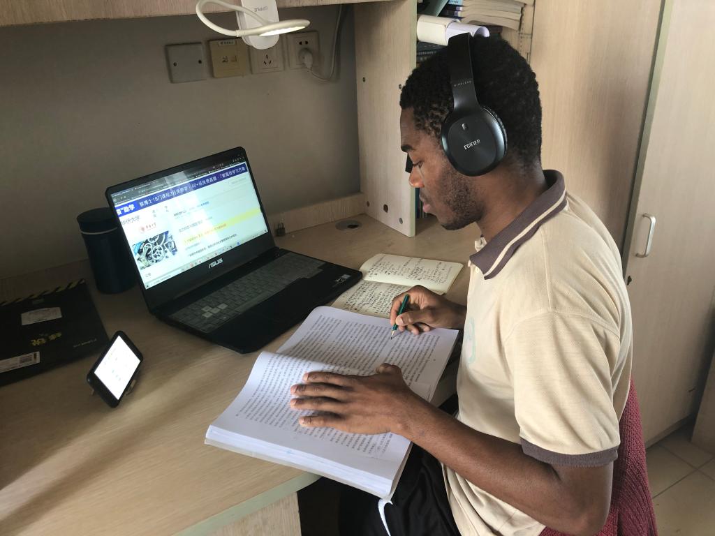 2月27日上午,华侨大学土木工程学院安哥拉留学生比特坐在宿舍书桌前,对着电脑,准备开始新一天的“线上学习”。