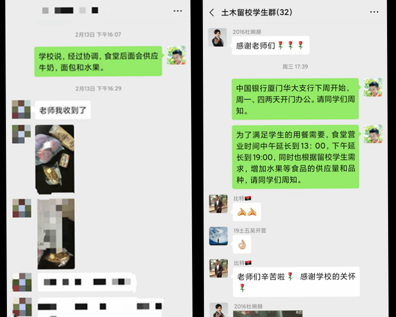 此外,各学院专门建立了留校学生微信群,并建立留学生一对一联系机制,每日暖心问候,及时关心思想动态、身体健康情况,解决学生遇到的困难;学生处负责人及各学院辅导员等还不定期地走访宿舍,带去水果等慰问品,疏导学生情绪等。