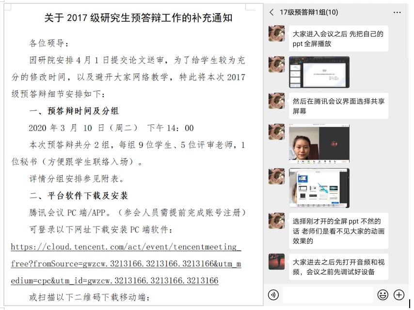 为最大程度减轻疫情对研究生学位申请与授予工作影响,确保学位申请各环节工作顺利进行,学校先后发布《关于制定疫情防控期间研究生学位申请与授予工作预案的通知》《关于2020年夏季毕业研究生学位申请与授予工作安排的通知》,要求各学院学位申请相关环节工作尽可能线上完成。在保证学位论文预答辩质量及效果的前提下,各学院可以根据自身情况制定视频录制评议、远程会议等灵活多样的预答辩方案。