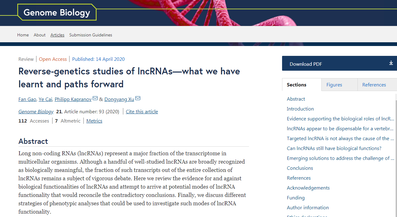 近日,医学院菲利普·卡帕诺夫教授团队在国际遗传学顶级期刊Genome Biology(IF = 14.03,JCR 1区TOP)发表题为“Reverse-genetics studies of lncRNAs—what we have learnt and paths forward”的综述文章。