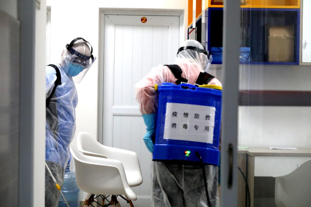学生宿舍演练现场,发热人员转走后,消杀组对现场进行消杀