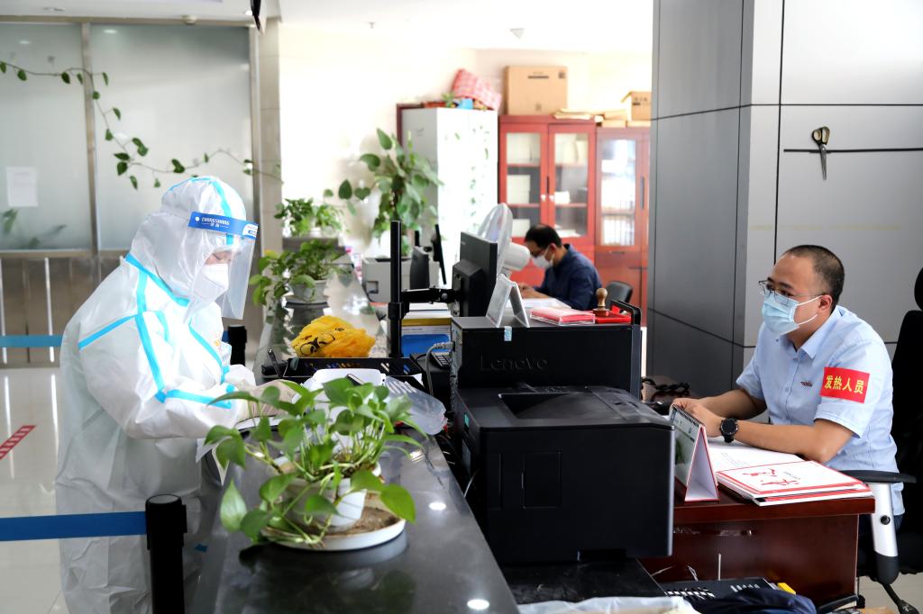 办公区演练现场,医护人员向发热人员了解居住史、旅行史和密切接触史等情况