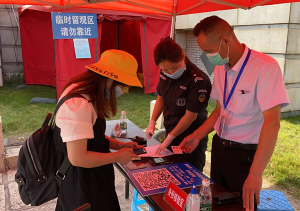 在校门口,学校为返校学生设置专用通道,经过“一检”“二核”“三查”“四通过”的返校复学报到流程,即测量体温,扫描签到码并出示身份证进行核对,查验健康码后才可进入校园。保卫处工作人员严守校门,引导返校学生报到入校,校医院工作人员也“严阵以待”,随时准备处置发热应急情况。