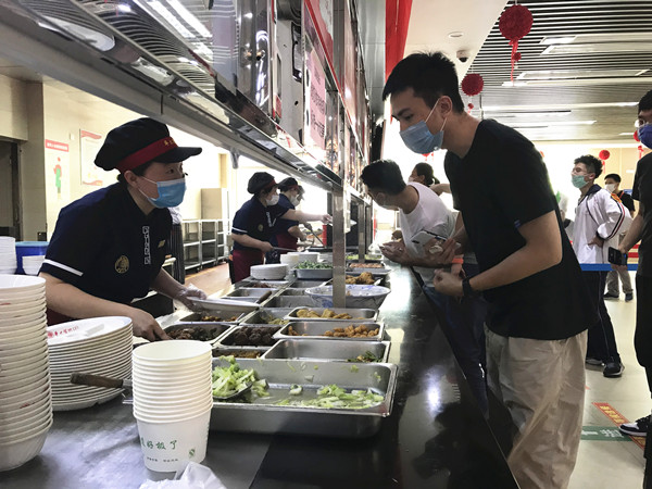 在食堂,每张餐桌上都贴有单人用餐、同向就坐的提示语。饭菜窗口后的工作人员均配备口罩、手套、围裙等全套装备。在食堂就餐的师生还不多,大家严格按防疫要求保持距离,有序用餐。此外,为减少用餐接触,对人流量进行控制,食堂还推出了外卖服务。