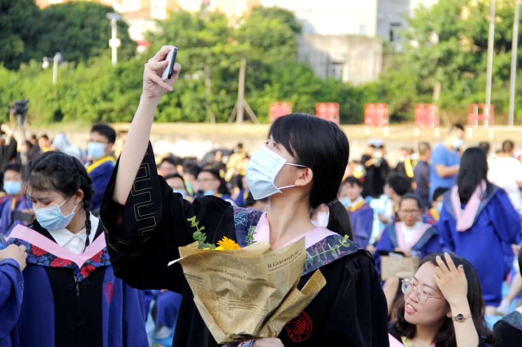 就连他们的毕业典礼,也与众不同:除了现场的4249名毕业生,世界各地还有2780名毕业生只能在线参加“云典礼”。即使现场参加典礼的毕业生,也无法在自己憧憬的陈嘉庚纪念堂内由主礼嘉宾亲自拨穗、恭喜毕业,而只能在户外由校长徐西鹏引领拨穗,为自己的大学生活勇敢翻篇,以至于有同学感叹:“只是在夕阳中站了一会,我们就毕业了。”