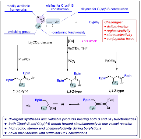 有机硼化合物是备受青睐的合成砌块。多硼化合物可以选择性地转化为多重官能团而令人着迷。不饱和化合物的硼化是构建多硼化合物最为有效的手段之一。然而,烯烃以及炔烃的硼化过程涉及的选择性问题是该类反应长期以来所面临的巨大困扰(图1A)。先前主要借助于底物的位阻效应、电子效应(导向作用)等因素来解决这类反应的选择性问题。1,3-烯炔的硼化研究,始终局限于单次硼化,一般得到丙二烯丙基硼衍生物,如何打破其共轭结构成为了一种挑战(图1B)。先前关于三氟甲基烯烃的硼化研究,一般得到氟消除的硼化产物——1,1-偕二氟烯丙基硼酸酯,如何抑制氟消除、化学选择性地保留有用基团CF3成为了另外一种挑战(图1C)。
