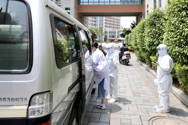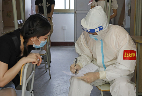应急处置医生对发热学生进行体温检测并询问健康情况