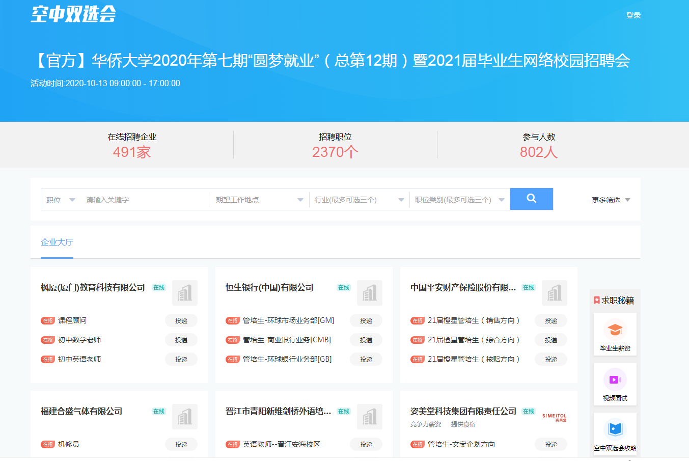 10月13日,我校本学期第一场大型招聘活动——华侨大学2020年第七期“圆梦就业”(总第12期)暨2021届毕业生网络校园招聘会举行,800余名毕业生参会并投递简历3000余份。