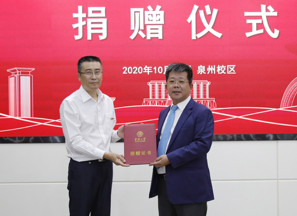 当日上午,广海集团副总裁、工商管理学院2003级校友蔡景浩向学校捐赠教育基金10万元;蓝海(福建)信息科技有限公司区域经理杨家裕,商务部总监、产品部总监曾省明向学校捐赠校庆车辆租赁费用。华侨大学教育基金会秘书长项士敏分别向蔡景浩、蓝海(福建)信息科技有限公司颁授捐赠证书。