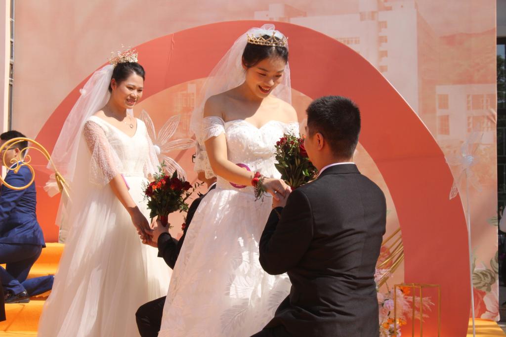 一对对身着盛装的伴侣,互相挽依,走过甜蜜的签字墙和照片墙,穿过鲜花点缀的门,在浪漫花柱的映衬下,在无数亲朋好友的祝福声中携手同行。他们中有的是从初中就相识;有的是才刚刚毕业的年轻伴侣;有的是回来看望母校的幸福五口之家。当每对新人走过花门,现场响起一阵阵掌声,大家用手机、相机记录下这美好的时刻,由衷地祝福新人们。