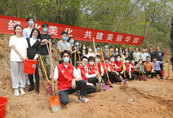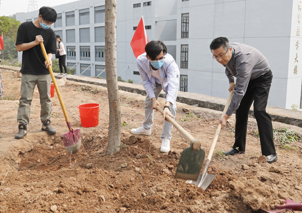 校领导徐西鹏、吴剑平、刘塨、刘斌、彭霈、毕明强,校长助理张云波,以及青年教师代表、在校境内外学生代表近50人,携手栽种下20余棵栾树和多花风铃木,为华园再添新景色。