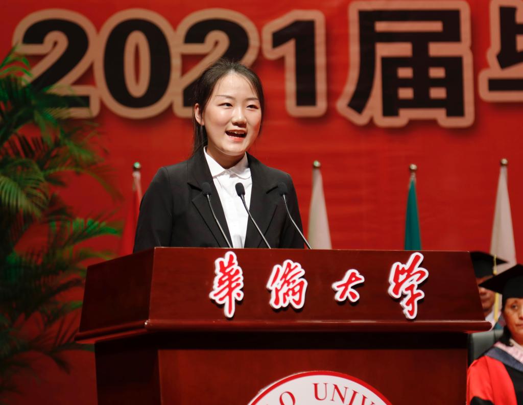 大家下午好!我是来自外国语学院2018级翻译专业的毕云笛,很荣幸能作为在校生的代表在2021届学长学姐的毕业典礼上发言。