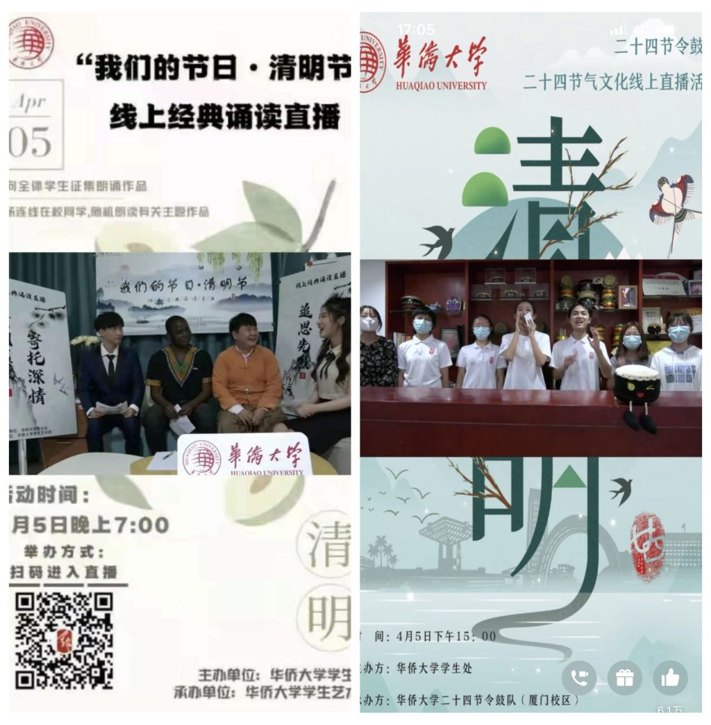 4月5日下午,由校二十四节令鼓队承办的“鼓乐·清明”节令鼓直播活动线上举行。我校泉州校区、厦门校区以及马来西亚学生组成的三支节令鼓队参与演出,近千境内外师生在线观看并参与线上线下互动。三支节令鼓队的表演风格各异,内容丰富多彩,《念》《逆行者》《咏乐》《衡》《心·奏》《浮生》等节目,为同学们带来一场“震撼心灵”的视听感受。直播活动也寓教于乐,安排了二十四节气科普小课堂、知识问答等活动环节,增进同学们对中华传统文化的了解。直播间热闹非凡,不少同学在观看表演后,纷纷在屏幕上打出“泉州加油”“华大加油”等弹幕。