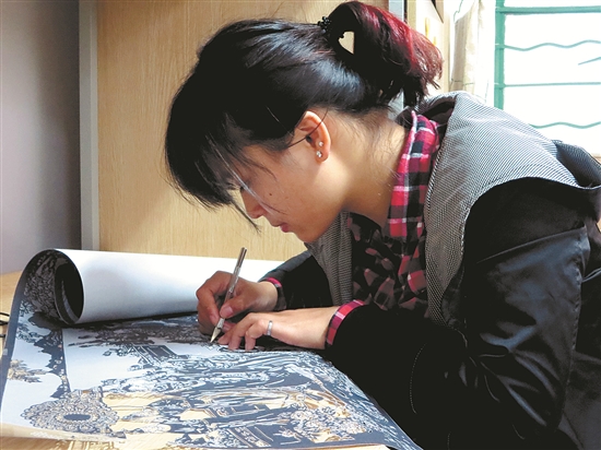 日前,记者走进华侨大学卢明的宿舍,她正坐在桌前,用刻刀在黑白分明的长纸上细致地刻画。记者走近一看,原来是《红楼梦》中的贾宝玉和金陵十二钗在贾府游园的场景。