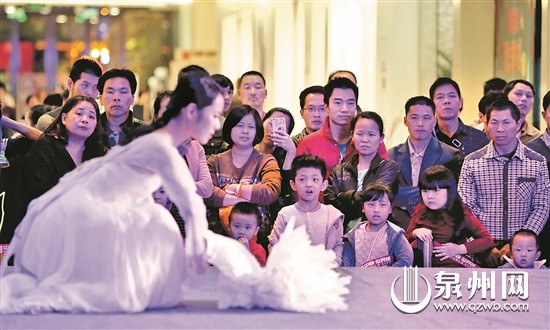 当晚七点多,中骏世界城中庭早早地围满了观看节目的市民。一位观众告诉记者,近期这里每天都有精彩的节目,因此,一到晚上,她都会带着孩子和老人来这里,除了逛商场,还有就是让孩子更好地感受泉州的文化和亚艺节的氛围。