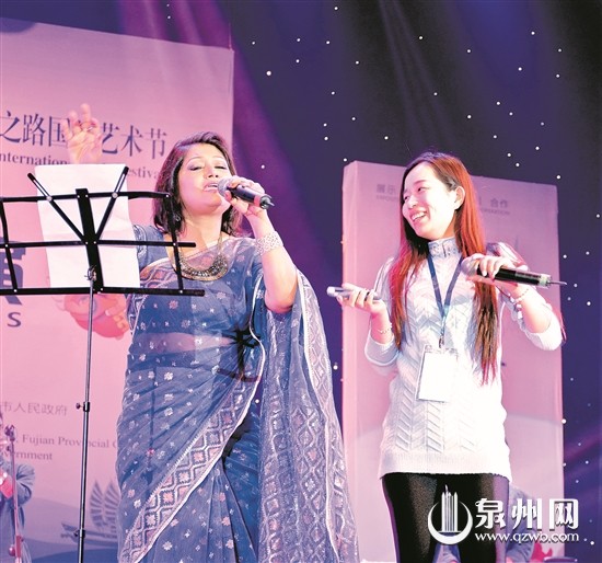 歌手罗曼娜一出场,纯情的音色立即引得观众阵阵掌声。唱完孟加拉歌曲,随后她选择一首中国歌曲《甜蜜蜜》,还出人意料地随机邀请惠安观众谢珊珊合唱,这名幸运的惠安女生落落大方地登台伴唱。