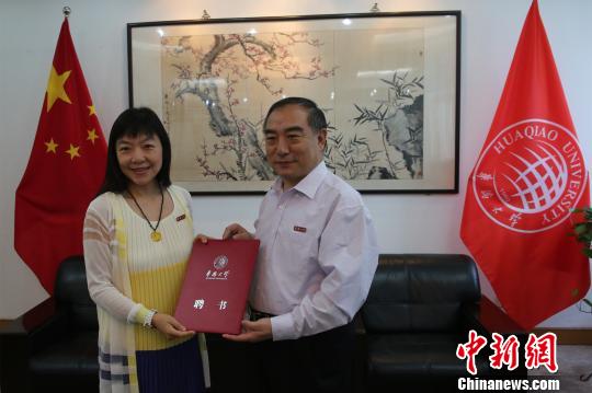 6月3日,凤凰卫视公关部总监陈越(左)受聘为华侨大学客座教授。 吴天适 摄