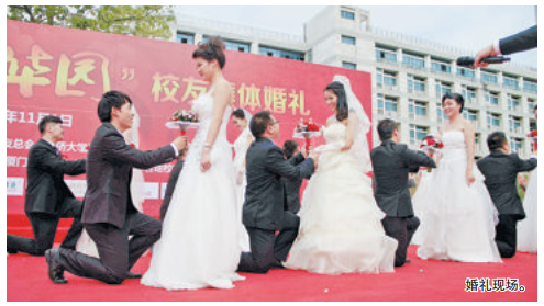 本报讯(文/图 记者 应洁 通讯员 朱考华)浪漫的花柱、大红的“双喜”剪纸——昨天的华侨大学比往日多了几分喜气和浪漫,16对“校友情侣”身着礼服,在同学、老师的见证下举办集体婚礼。新人们的“面子”不小,校长都亲自出马担任证婚人。