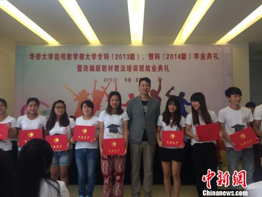 9日,华侨大学昆明教学部大学专科(2013级)、预科(2014级)毕业典礼暨改编版教材教法培训班结业典礼在昆明华文学校举行,来自缅甸、泰国、老挝等国家的95名毕业生参加了毕业典礼。