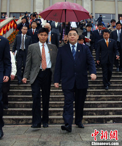 11月6日,澳门特别行政长官崔世安(右前1)出席华侨大学建校50周年庆祝大会。图为崔世安在参加大会后步出礼堂。张丽君 摄