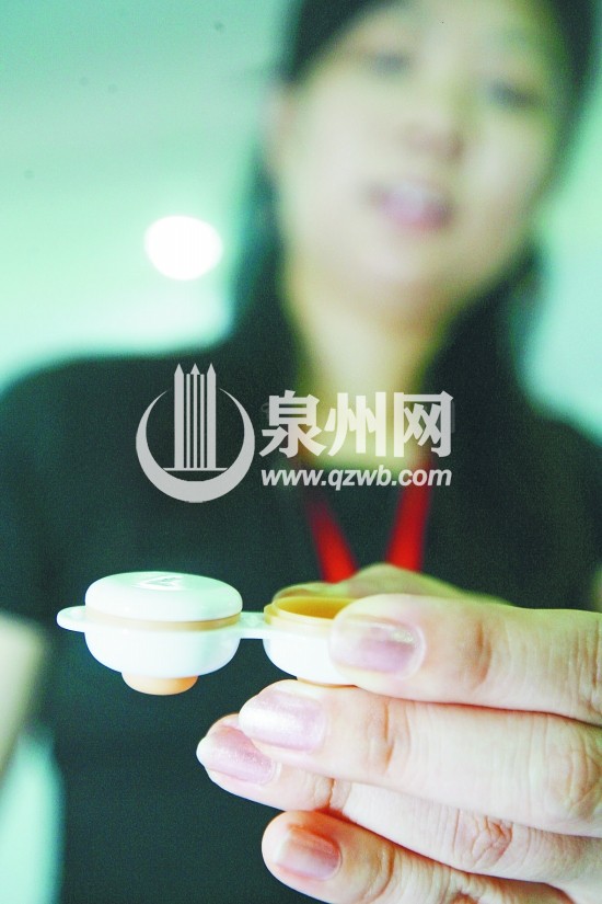 细瞧下压式隐形眼镜盒,与普通隐形眼镜盒并无太大的不同,白色的盒子,盖上分别写着“L”、“R”字母以区别左右眼。“其创意特色就在于,这个隐形眼镜盒下面的一个小装置。”詹孝中老师介绍,很多隐形眼镜使用者在戴隐形眼镜时都要用手戴,若手没有清洗干净,很容易导致眼睛过敏,而这个隐形眼镜盒的特色就在于,使用者手指可以不用碰镜片,就能将眼镜戴上。“眼镜盒下有一个下压式装置,要戴时,只需按住按钮,对准眼睛,镜片就可直接戴上。”