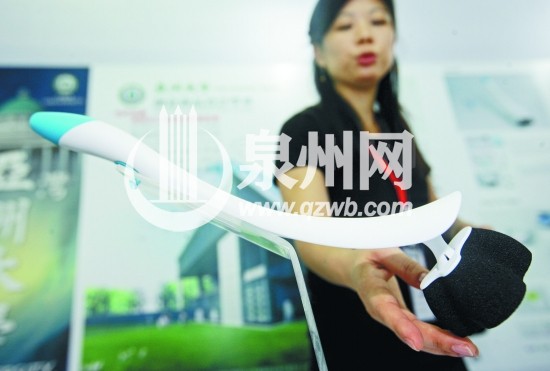 走进台湾馆,仿若进入一个现代化高科技的生活用品展馆,这里有无线充电器、回力清洁集尘器、马桶刷,还有切蛋糕的小物件……台湾馆亚洲大学创意商品设计系老师詹孝中介绍,此次展出的学生创意作品有14件,其中下压式隐形眼镜盒和马桶刷分别在日内瓦、马来西亚国际发明展中获得金牌。