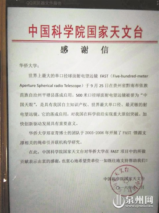 日前,华侨大学博士郑亚青及其团队收到了一封来自中国科学院国家天文台的感谢信,信中感谢了他们在“中国天眼”——500米单口径球面射电望远镜项目(以下简称FAST项目)中所作的贡献。