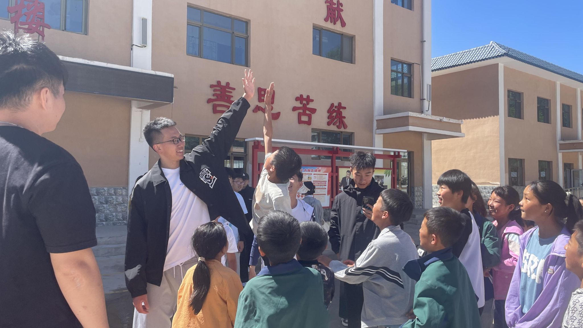 值得一提的是,今年,支教团联合华侨大学学生男子篮球队(中国大学生篮球联赛冠军队)成员共同为孩子们带来篮球科普课堂及篮球户外教学。在篮球知识科普小课堂上,他们向孩子们介绍篮球发展史、篮球比赛规则、国内外著名运动员等,并通过视频分享华大男篮的训练日常和比赛集锦,以亲身成长经历鼓励孩子们积极投身体育运动。户外课上,球员们的示范展示引来了孩子们的阵阵欢呼,运球游戏、投篮接力等有趣的课程环节让孩子们乐在其中。而为了进一步夯实孩子们追梦篮球梦的信念,7月28日,支教团及华大男篮队组成的华侨大学代表队还与积石山县教育系统代表队在县体育场打了一场友谊赛。