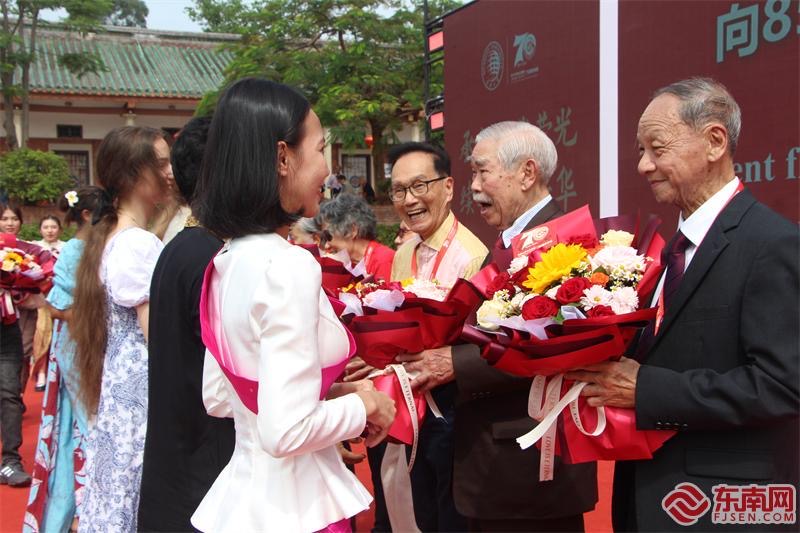新生代表向85岁以上老校友集体献花(东南网记者 李霖 摄)