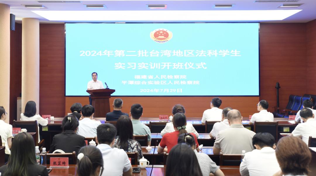 7月29日,平潭综合实验区检察院举办2024年第二批台湾地区法科学生实习实训开班仪式。福建省检察院党组副书记、分管日常工作的副检察长施忠华,实验区党工委委员、政法工作领导小组组长陈毅坤,中国政法大学党委常委、副校长卢春龙,实验区检察院党组书记、检察长王桦,中南财经政法大学法学院党委书记张学平,华侨大学法学院党委副书记(主持工作)张彬出席活动。