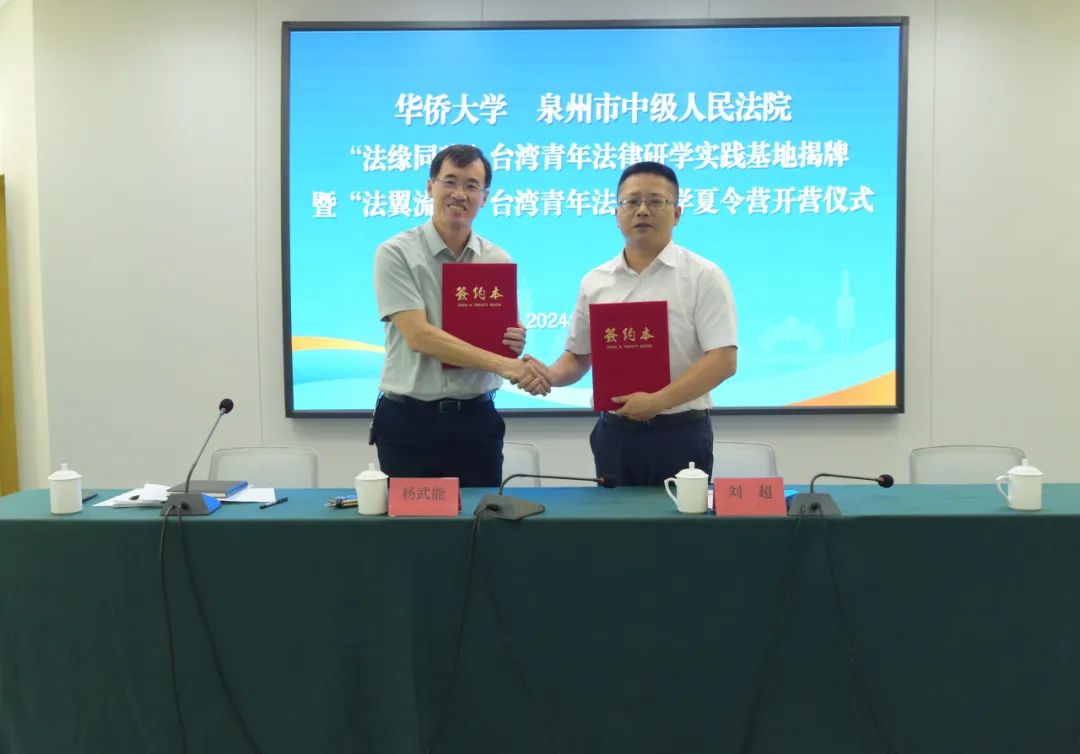 ↑图为泉州中院与首批共建单位——华侨大学共同签署合作协议并举行揭牌仪式。