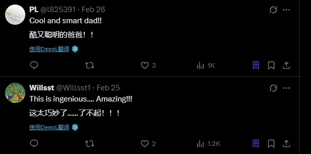 外国网友纷纷对这位“硬核老爸”点赞,“很酷又聪明的爸爸!” “玩具店会很喜欢这家伙!”“这太巧妙了......了不起!!!”