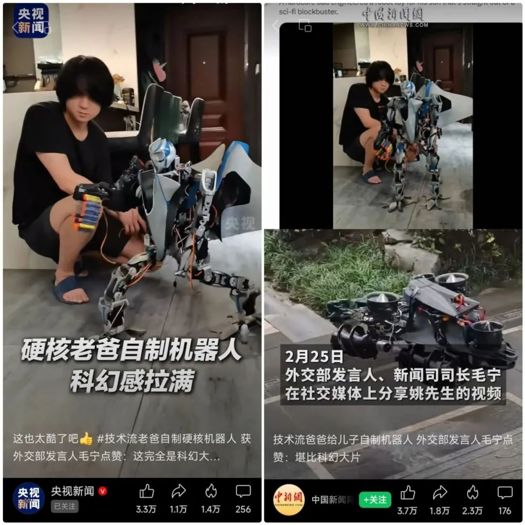 外交部发言人毛宁在社交平台转发该视频并配文称赞,“一位硬核老爸为自己儿子制造的机器人,它们就像直接从科幻大片中走出来的那样!”