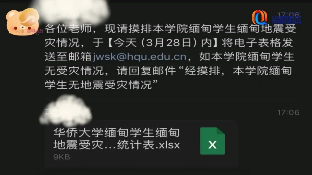 华侨大学缅甸籍学生 闫自仙:“第一时间就离开了课间,去给父母打电话,但是一直没有打通,我又想了一下就打给了我的表弟,听他那边了解到我们家那边的情况是还可以,就进了华人华侨和当地华裔大家组织的群,那里面就会有实时的更新地震的信息,哪里需要救援或者是一些有自助免费餐食的餐厅,大家都有在那个群里面更新信息,大家一起互帮互助。”