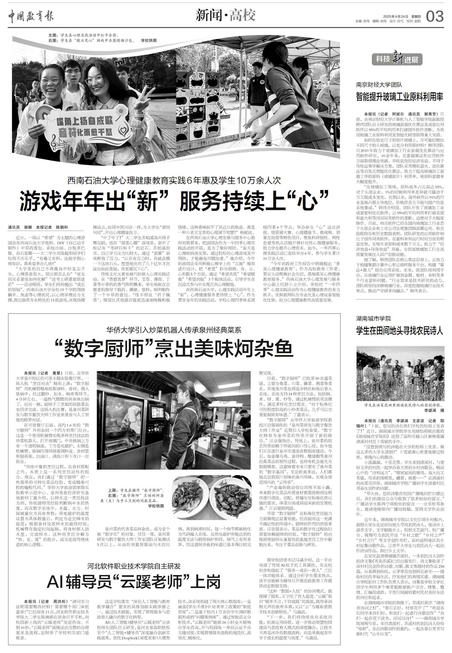 本报讯(记者 黄星)日前,在华侨大学泉州校区的可浓主题实验餐厅里,一场人机“烹饪对决”精彩上演:“数字厨师”用机械臂精准抓取调料、食材,倒入铁锅中,经过翻炒、加水、焖煮等环节,4分钟左右,一道热气腾腾的炣杂鱼出锅了,而另一侧,厨师手工烹制的同款菜品也同步完成。这场人机比赛,是泉州菜研发与数字餐饮大师工作室里美食与人工智能的跨界对话。