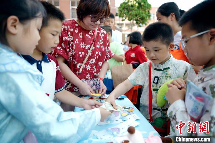 中新网厦门5月31日电 (李思源 林频 蔡锦阳)“三年五班豹跃小铺,清仓大甩卖!”端午节前夕,厦门市莲龙小学人头攒动,一场融汇童趣与民俗的庆“六一”暨端午创意市集火热开张。恰逢端午与儿童节罕见相邻,厦门校园以创意活动搭建传统与现代的桥梁,让千年民俗在少年儿童的欢声笑语中焕发新活力。