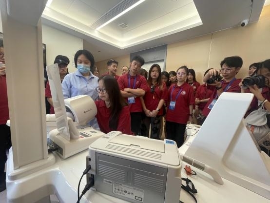 在乌镇智能医院, 同学们详细了解了智能诊断 、机器人 配药等创新应用 。 智能机器人按照医嘱精准抓取药品 、核对 信息, 其高效准确的操作让大家连连称赞, 深刻体会到科技 为医疗领域带来的巨大变革 。蔡裔姵同学感 叹:“这种高效便捷的就医模式令人惊叹, 不仅整合了优质 医疗资源, 还真正做到了以患者为中心, 让医疗服务更有温 度 。 ” 而来自柬埔寨留学生秦语晨同学则分享道: “ 在我 们家乡, 医疗科技还处于起步阶段, 看到乌镇智能医院如此 先进的设备和系统, 真的大开眼界, 也感受到了中国在医疗科技领域的强大实力,这对全球医疗发展都有着重要的借鉴 意义 。 ”