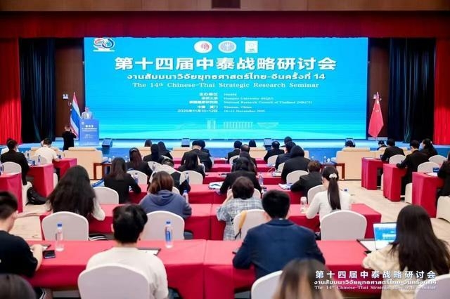 2025年11月11日,由华侨大学、泰国国家研究院共同主办的第十四届中泰战略研讨会在厦门举行。研讨会以“中泰友谊金色50年:开启命运与共新时代”为主题,华侨大学党委常委、副校长林宏宇教授、泰国国家研究院执行秘书长薇帕拉·迪翁博士、中国—东盟中心新闻公关部主任周娜帕女士在开幕式上致辞。泰王国驻厦门副总领事冰忆莲等来自中泰两国的近百名专家学者、政府官员及各界代表齐聚一堂,共同回顾中泰建交50年来的合作成果,展望未来合作方向,为推动中泰全面战略合作伙伴关系迈向更高水平贡献智慧。开幕式由华侨大学国际关系学院院长王秋彬教授主持。