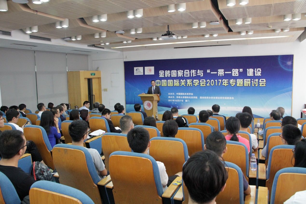 习近平总书记在十九大报告提出,推动建设相互尊重、公平正义、合作共赢的新型国际关系。积极促进“一带一路”国际合作、深化同周边国家关系、加大对发展中国家特别是不发达国家的援助力度,促进缩小南北发展差距。这一宏伟构想,在国际关系学界引发热议,为了更好的贯彻落实党的十九大精神。中国国际关系学会围绕大会报告精神,27-28日在华侨大学厦门校区连续举办了第十二届博士生论坛“全球治理与大国外交”论坛以及“金砖国家合作与一带一路建设”学者专题论坛。来自外交部、中共中央党校、中国社会科学院、外交学院、上海社会科学院、复旦大学、国防科技大学、浙江大学、武汉大学、厦门大学、同济大学、苏州大学、湖南大学、延边大学、国际关系学院、大连外国语大学、湘潭大学、云南民族大学、华侨大学、荷兰奈梅亨大学等近30家研究机构、高校及政府部门、社会组织的80余名专家学者齐聚华侨大学,围绕“金砖国家合作与一带一路建设”的主题,就金砖国家关系、全球治理与大国外交、“一带一路”建设等议题展开深入探讨。中国国际关系学会常务副会长、外交学院院长秦亚青教授,华侨大学校长徐西鹏教授等出席开幕式。华侨大学国际关系学院院长林宏宇教授主持开幕式。